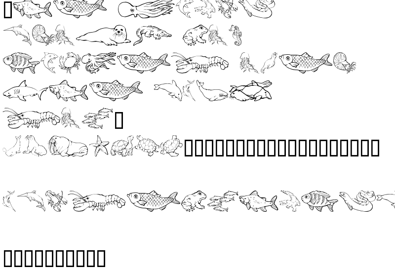 Explore more fonts with these tags: pictures, dingbats, animals, sea, ocean, fish, turtle, walrus, eel, octopus, shark, starfish, lobster, frog, seal, seahorse, zoo, crab, crayfish